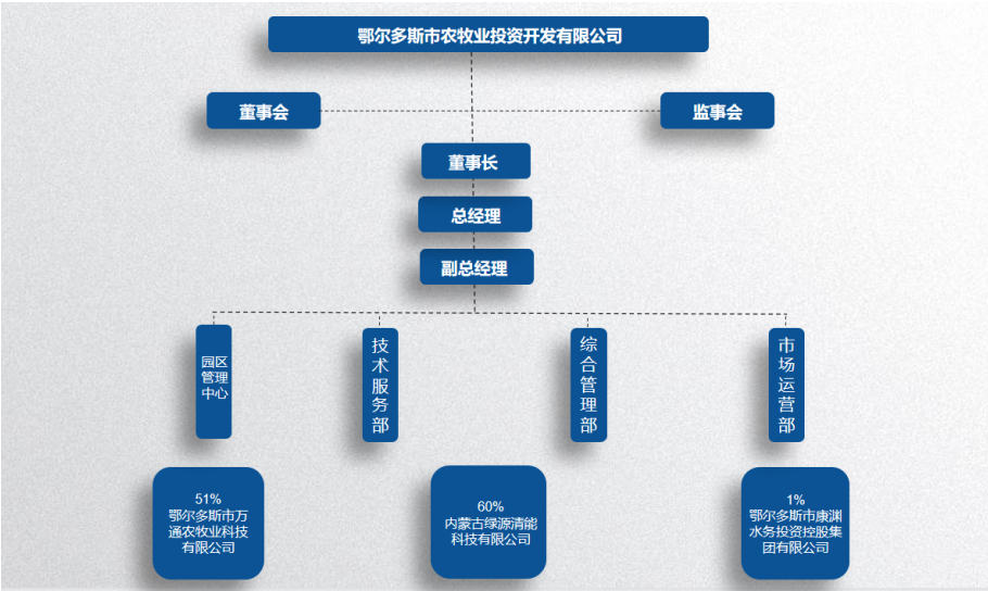 鄂尔多斯市农牧业投资开发有限公司注册成立于2013年2月27日,是由鄂尔多斯市水务投资控股集团有限公司出资的全资国有企业,注册资本壹亿元。公司位于伊旗阿镇桑盖四村,内设4个部门,下辖2家控股子公司,分别为鄂尔多斯市万通农牧业科技有限公司、内蒙古绿源清能科技有限公司。