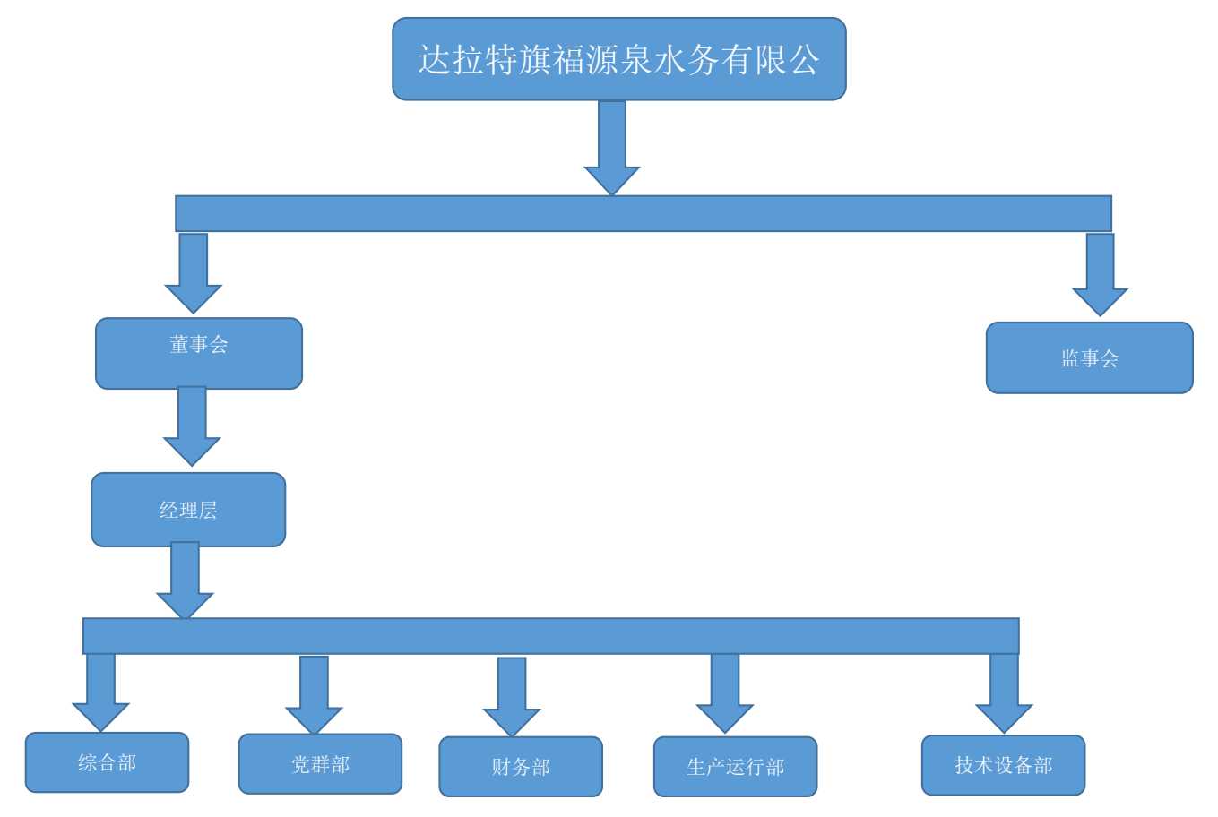 达拉特旗福源泉水务有限公司是由鄂尔多斯市水务投资控股集团有限公司股比47.3948%;刘朝波股比40.1825%;内蒙古水务投资集团有限公司股比7.2711%;达拉特旗国有资产经营有限责任公司股比5.1516%,四家共同出资组建成立的国有控股公司,现注册资金为31353万元。公司成立于2009年8月24日,经营范围:水供应(不含生活供水)、排污、污水处理,以及水利工程项目的投资,供排水管网设施建设及维护。公司目前主要供水市场有四处,分别是三垧梁工业园区、图克工业园区、鄂尔多斯装备制造基地、鄂尔多斯市泊江海子遗鸥自然保护区。公司内设部门设有综合部、财务部、技术设备部、生产运行部、党群部,人员38人。企业理念:廉俭养德 勤劳兴业 礼敬合众 敦品致远;企业使命:护航经济 保障民生;企业精神:自强不息 与时俱进;企业目标:做一家诚信、安全的水供应商。