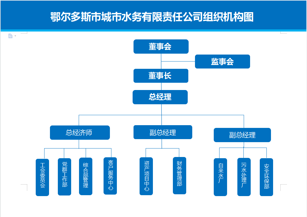公司设有自来水厂、污水处理厂、客户服务中心、安全环保部、财务部、资产项目中心、党群工作部、综合管理部,共8个部门,现有职工140人。